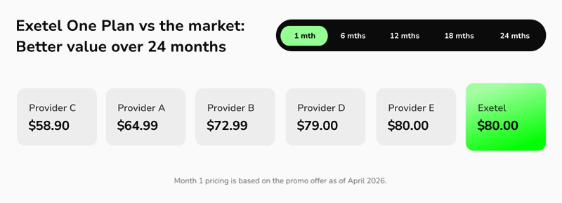 Promo pricing looks cheaper upfront, but consistency wins over time. Exetel One stays at $80/month from day one, while many promo offers rise sharply after the discount period ends. Over 24 months, that consistency adds up.