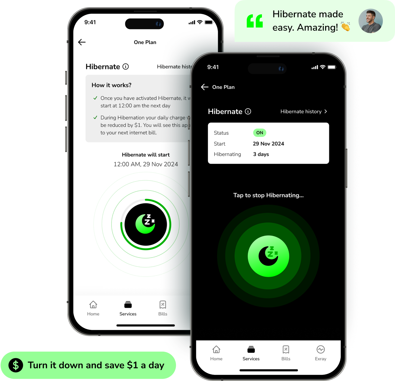 Hibernate’s perfect for those times you’re not online as much but still want to keep your connection going—without the hassle of switching plans or dealing with surprise fees. Just pay less, and save more.
