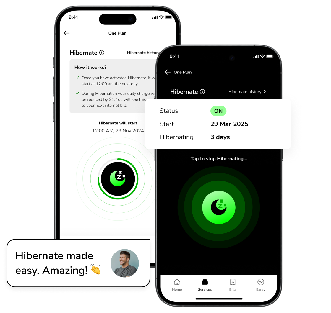 Hibernating your service is simple with the Exetel mobile app. Just open the app, switch Hibernate to ‘ON’, and your speed will slow down at midnight the next day. From then, you’ll be saving $1 dollar a day for each day that Hibernate is active, sweet huh?