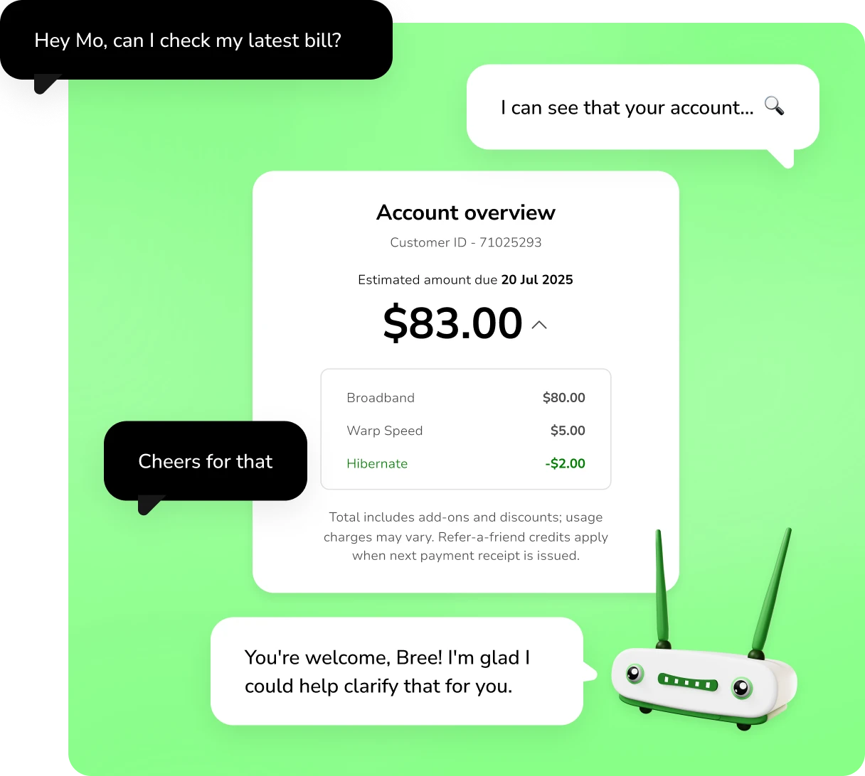 I can help you stay on top of your account. From viewing your services to checking bills and updating payment details. I’m your go-to robot for the job.